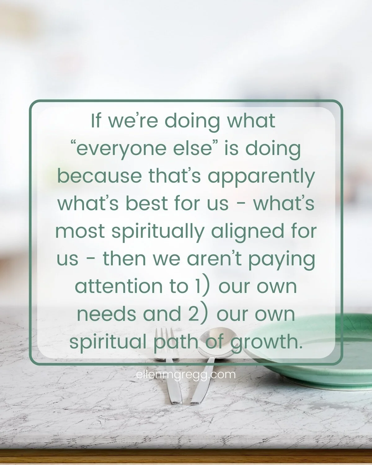 Because with every body being different based on nature and everybody being different based on nurture, we all have different needs that are constantly evolving. If we’re doing what “everyone else” is doing because that’s apparently what’s best for us - what’s most spiritually aligned for us - then we aren’t paying attention to 1) our own needs and 2) our own spiritual path of growth.